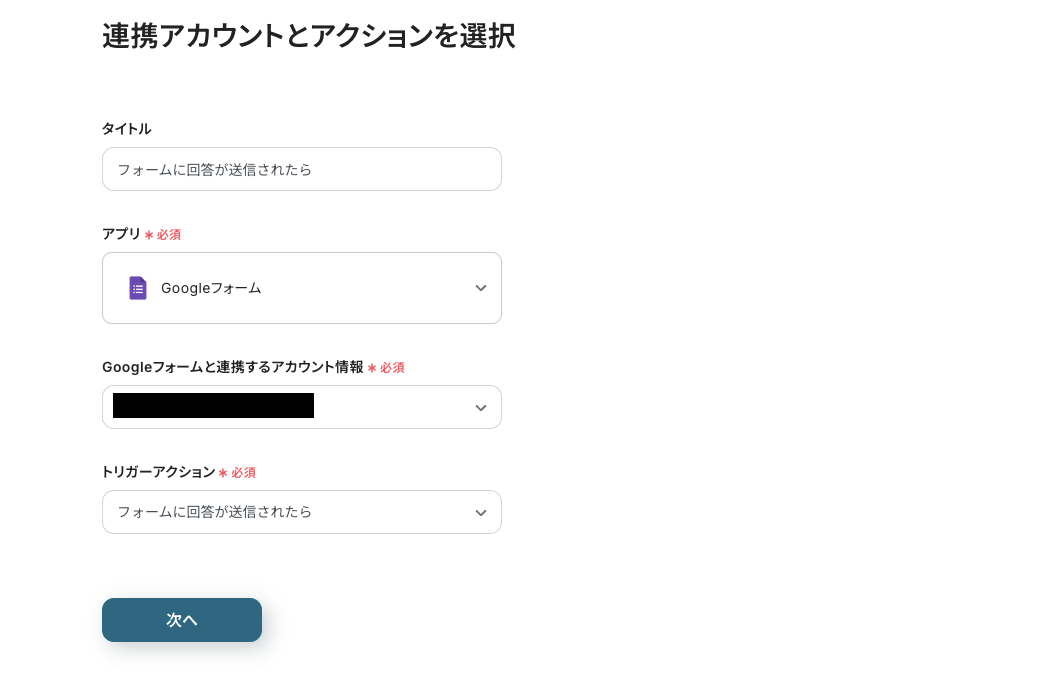 まずは、トリガーとなる「フォームに回答が送信されたら」をクリックして、連携するアカウント情報が入力されていることを確認してください。
