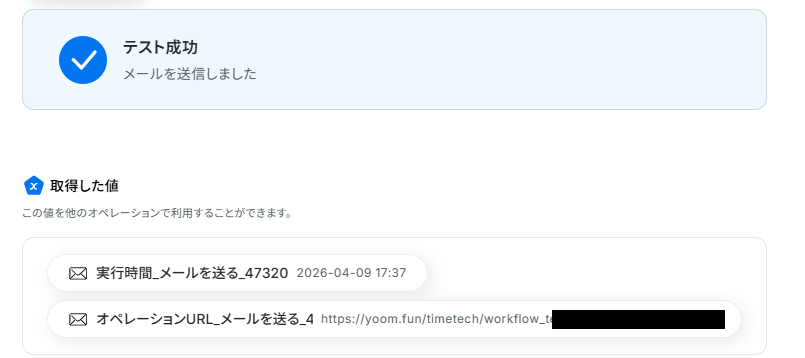 ここまで設定が終わったらテストボタンをクリックしましょう。テストが成功し、生成された値が取得した値に入ればOKです。