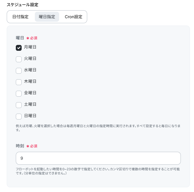 - スケジュールトリガーでは、毎日や毎週など、このワークフローを起動する頻度や時刻を任意で設定してください