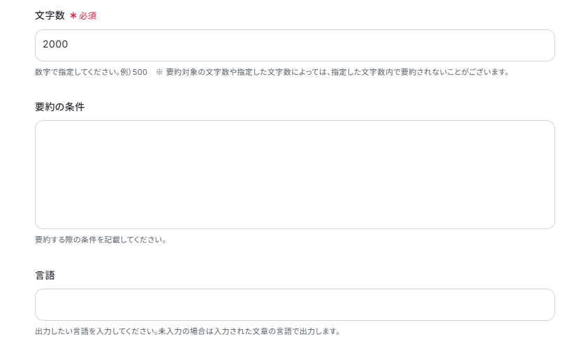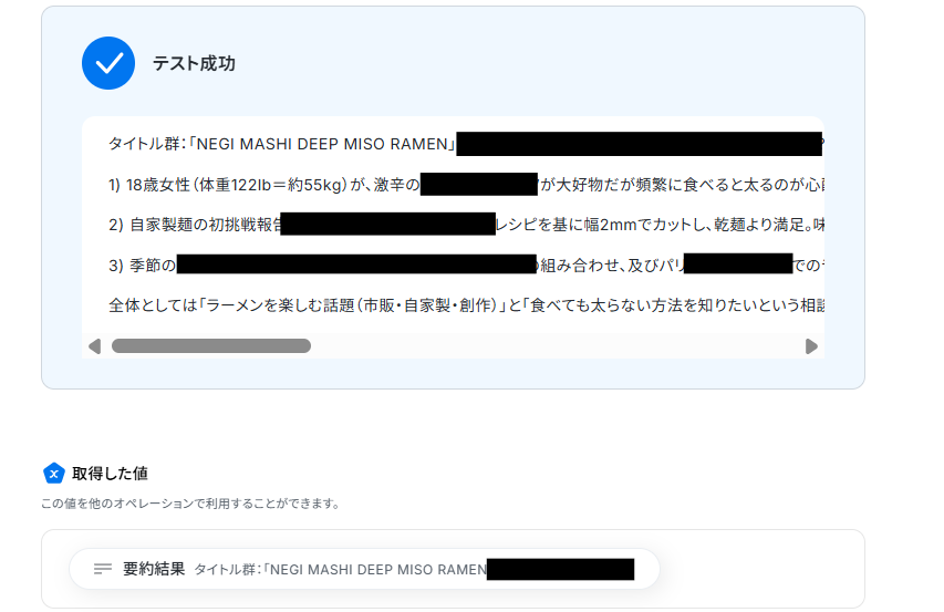 「要約対象のテキスト」は取得した値を使って入力された、デフォルトの値を使用しています。