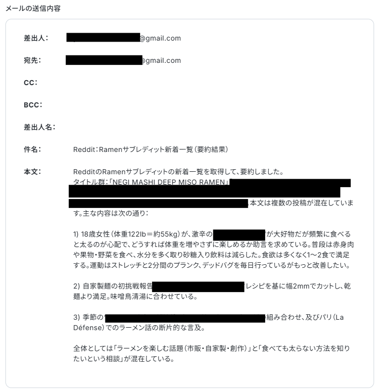 - Gmailでの通知設定では、送信先のメールアドレスを自由に設定できるほか、件名や本文にRedditや要約機能で取得した情報を埋め込むことができます