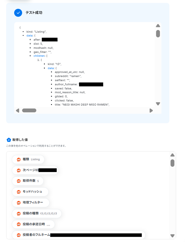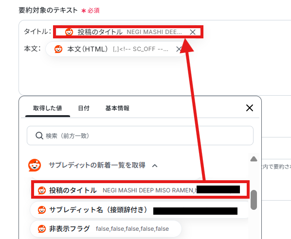 - AI機能のオペレーションでは、Redditの投稿情報の中から、タスク作成に利用したい項目を任意で設定して抽出できます。