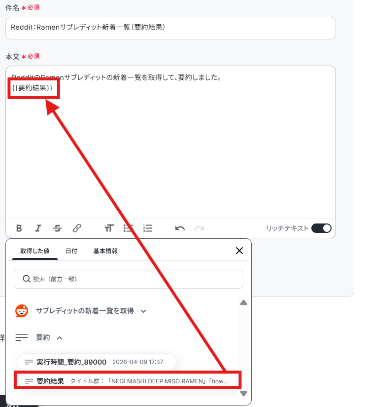 - Redditに投稿するタイトルや本文は、固定のテキストだけでなく、トリガーで取得したYouTubeの動画タイトルやURLなどを組み込んで自動作成できます。