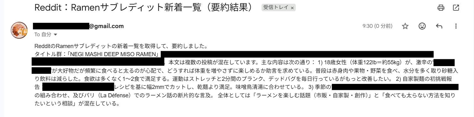 もし、指定したサブレディットの新着投稿一覧を定期的に自動で取得し、その内容を要約してメールで通知してくれる仕組みがあればいいなと思いますよね。