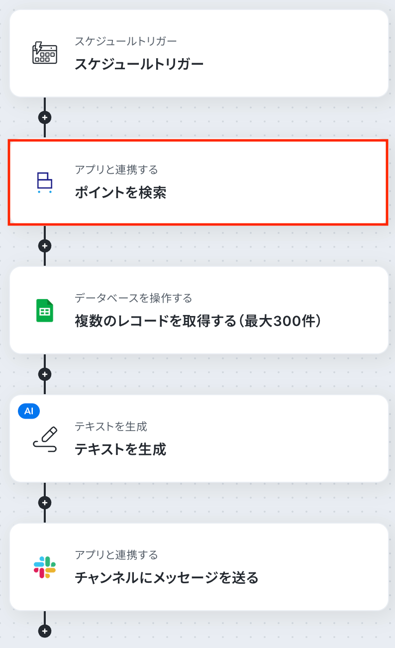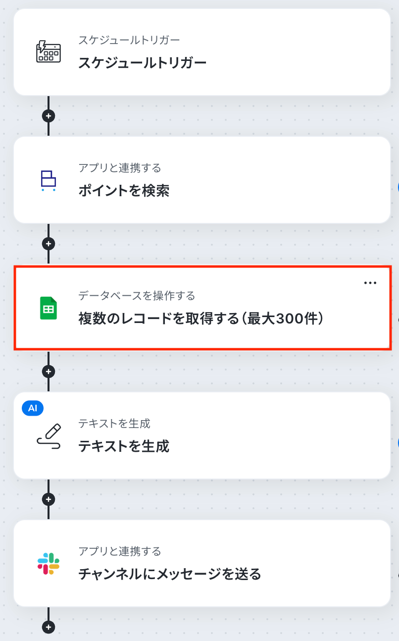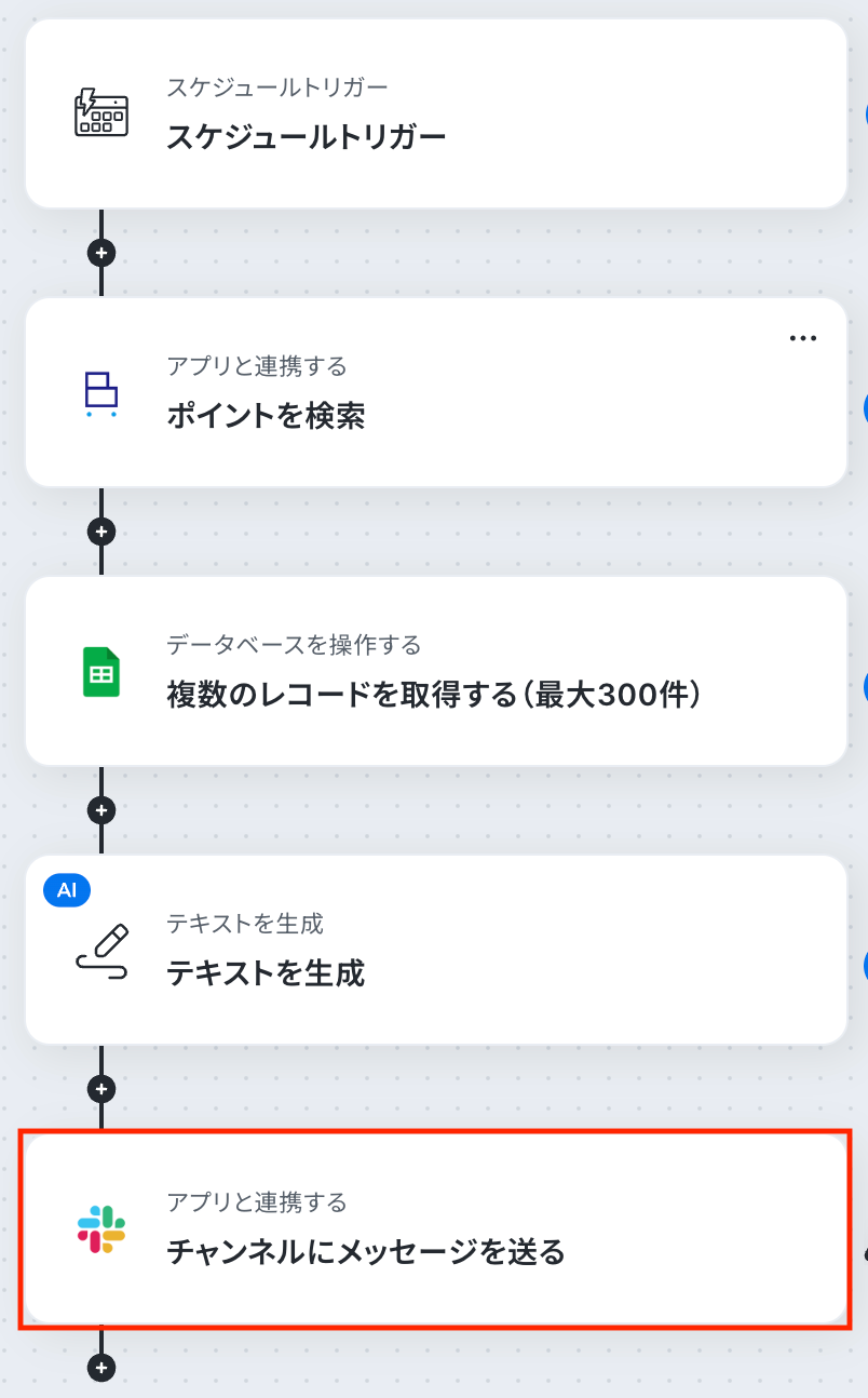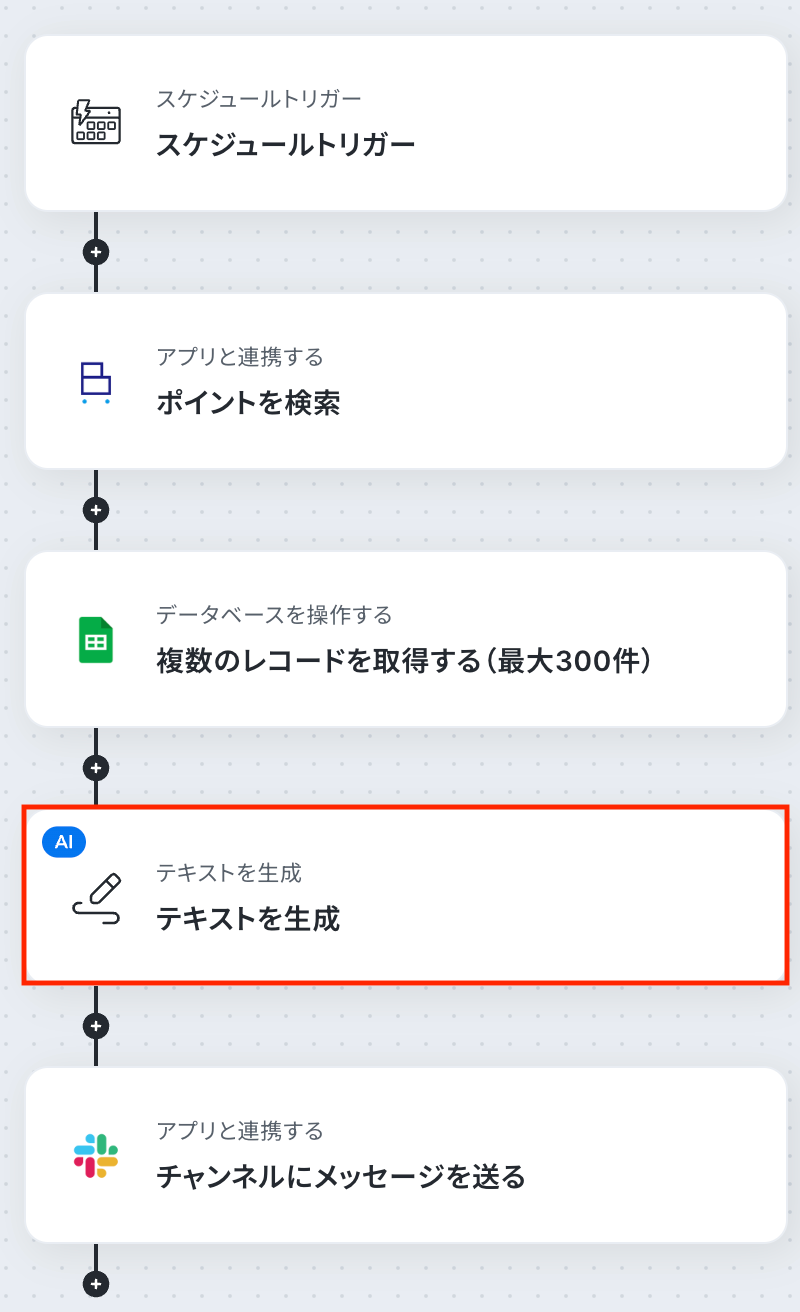 続いて、前のステップで取得したBカートの未処理ポイント情報とGoogle スプレッドシートの除外リストをもとに、AIでSlack通知用のテキストを生成しましょう。