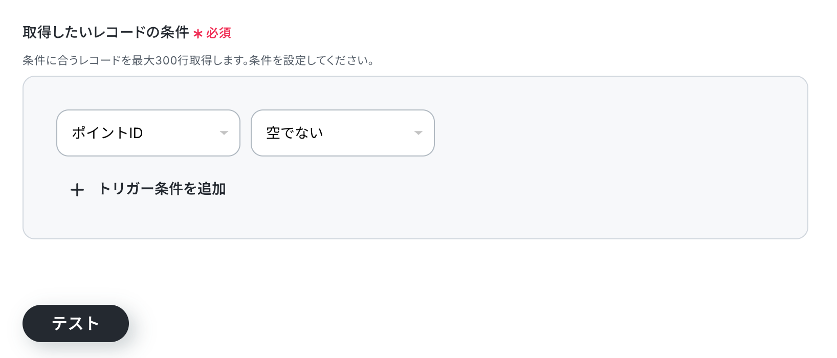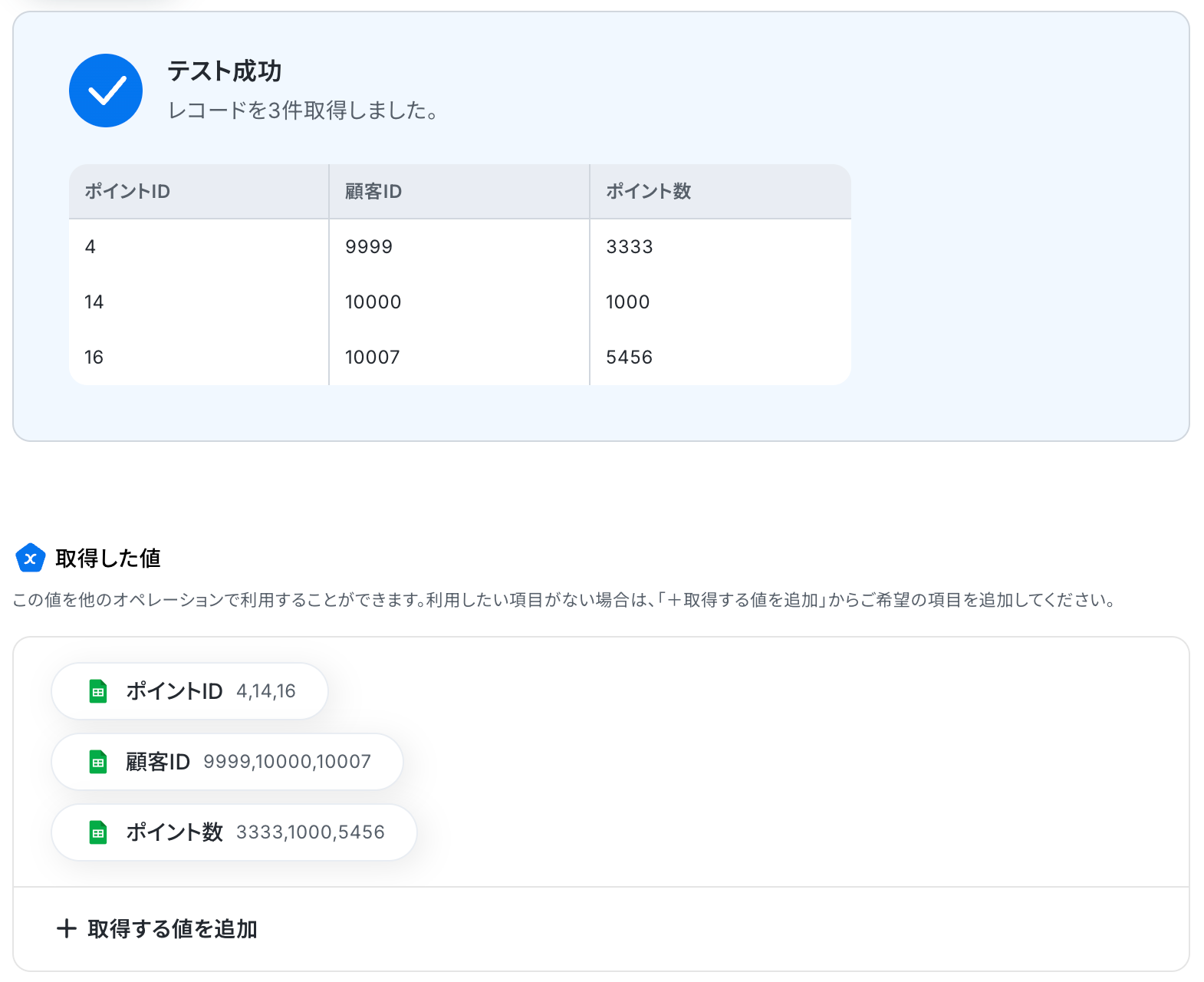 今回は、対象のGoogle スプレッドシートから、「ポイントID」の列が空でないレコードを取得するように設定しました。