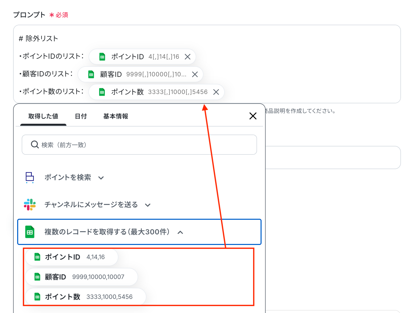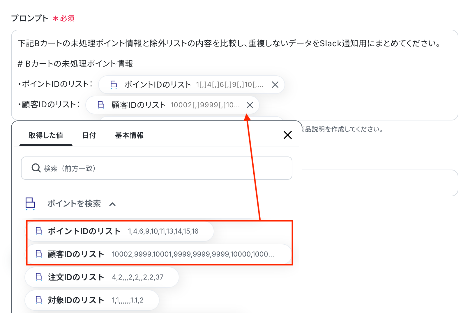 また、Bカートの未処理ポイント情報と除外リストを比較し、重複するデータを除外したポイント情報のみをテキスト生成するため、デフォルトのプロンプトを設定しました。