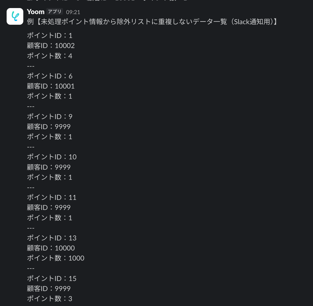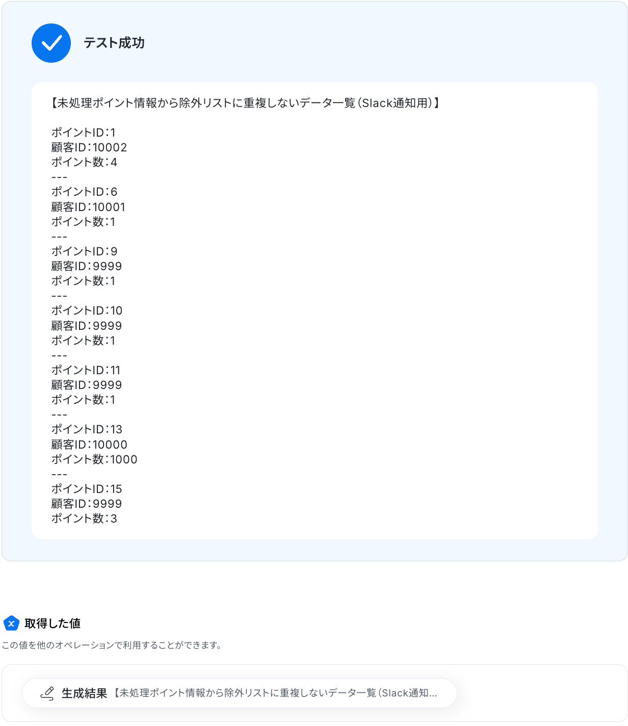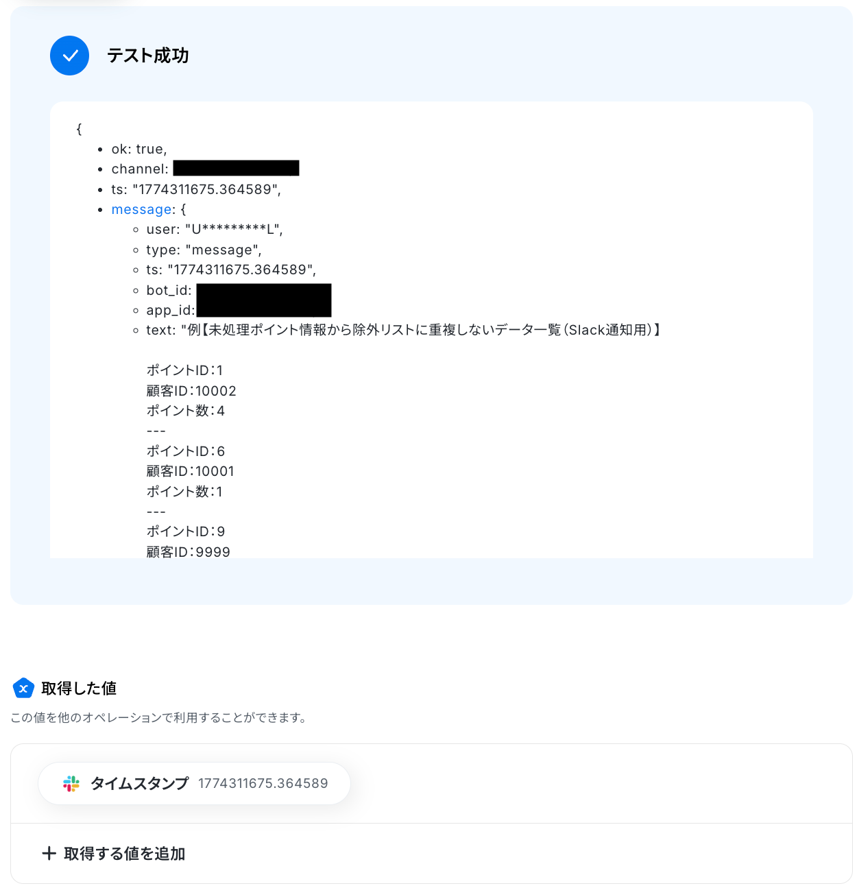 前のステップで取得した値を活用し、Slackで除外対象を除いた未処理ポイント情報を通知しましょう。