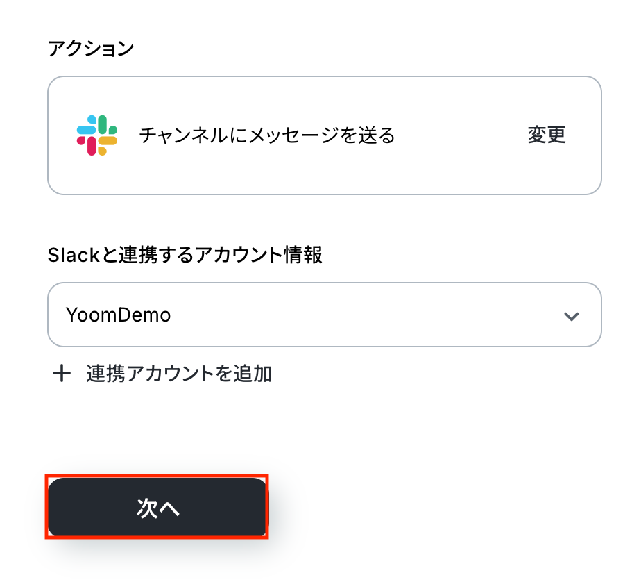 Slackと連携するアカウント情報に問題がなければ、「次へ」をクリックします。