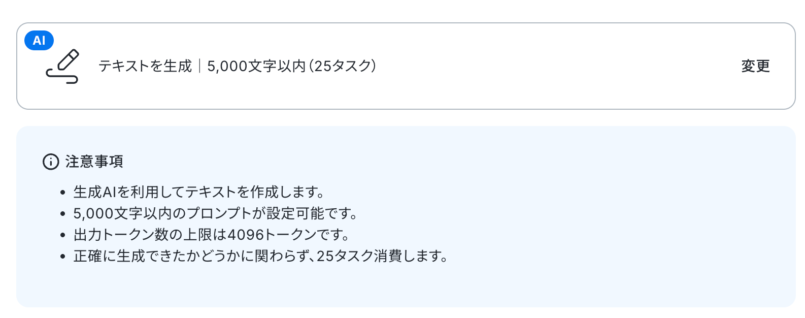テキストを生成するアクションは、指示可能なプロンプトの文字数によって消費するタスクが異なります。