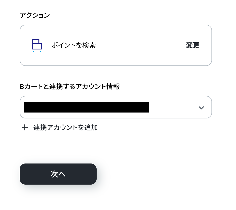 Bカートと連携するアカウント情報に問題がなければ、「次へ」をクリックします。