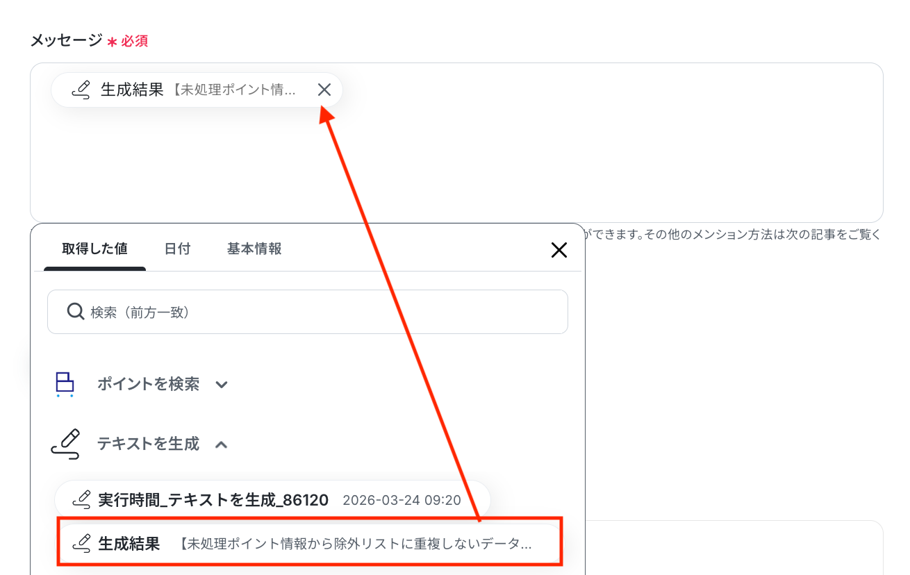 入力欄をクリックすると、前のステップでテキスト生成した値が表示されるので、選択しましょう。