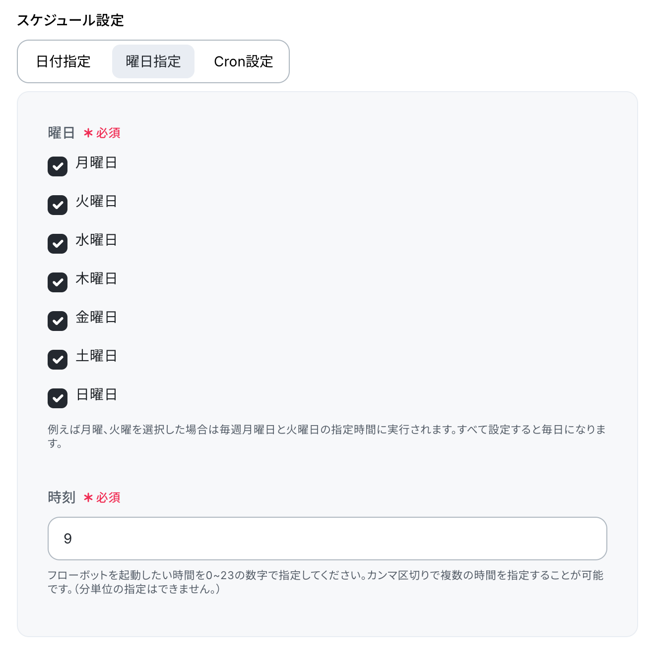 今回は、毎日9時にフローボットを実行するよう以下のスケジュールを設定しています。