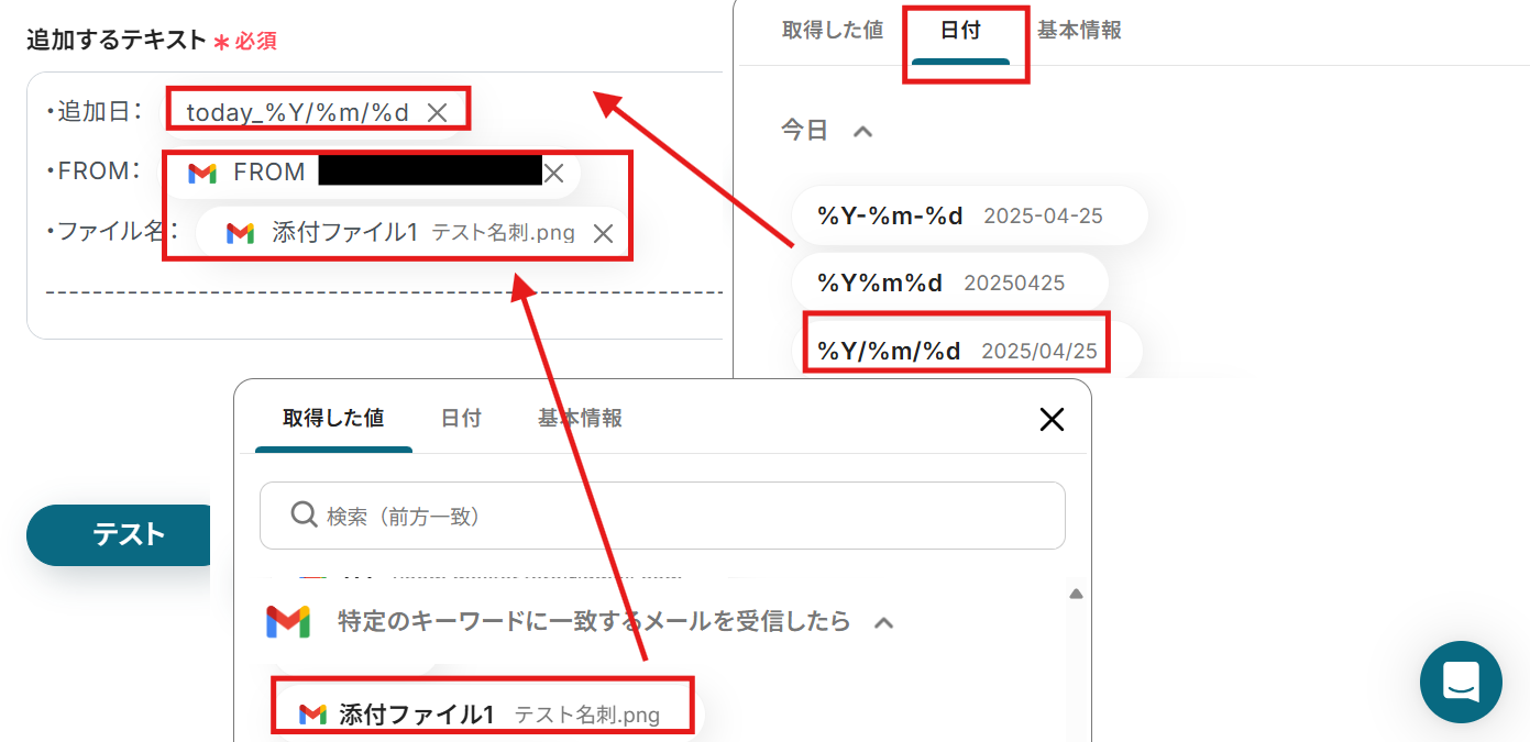 メールアドレスなどを手打ちで入力してしまうとそれが毎回通知されてしまうため、項目名以外のトリガーから取得した項目は必ずアウトプットから選択してください。