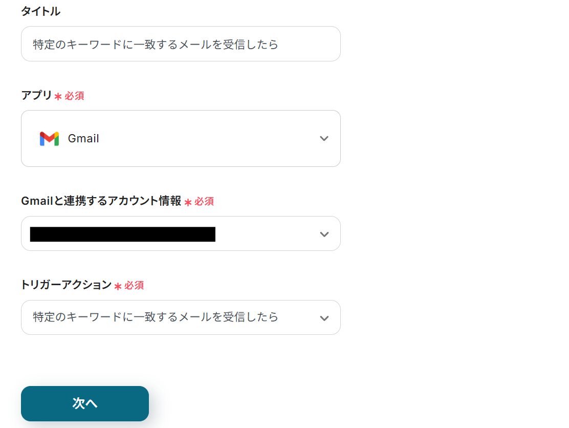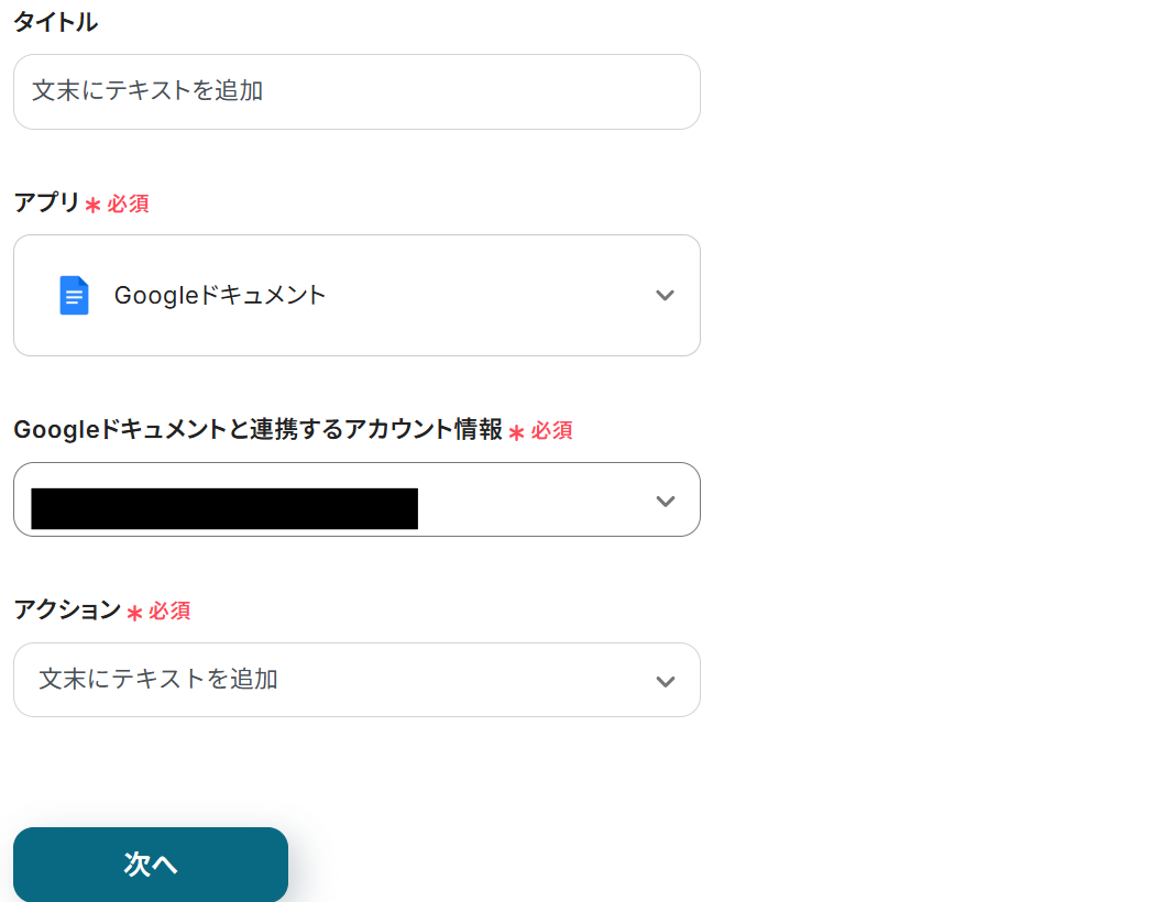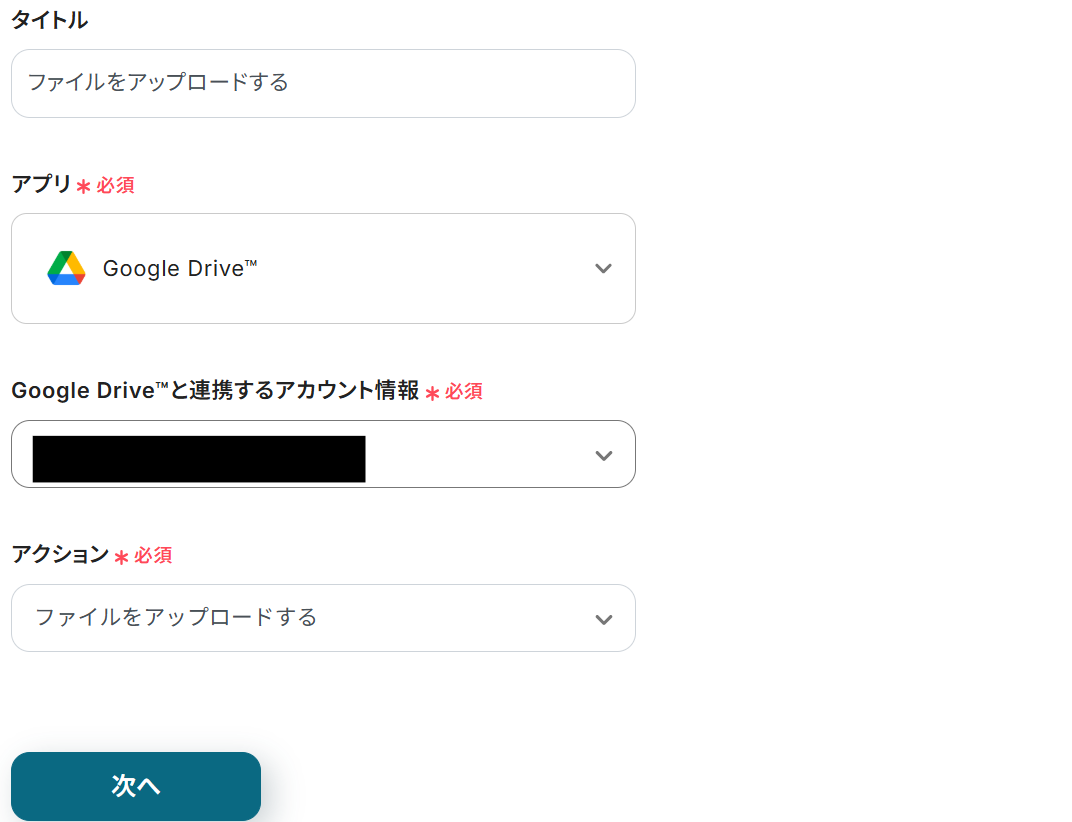 タイトルと連携するアカウント情報を任意で設定し、アクションはテンプレート通りのまま「次へ」をクリックして進んでください。