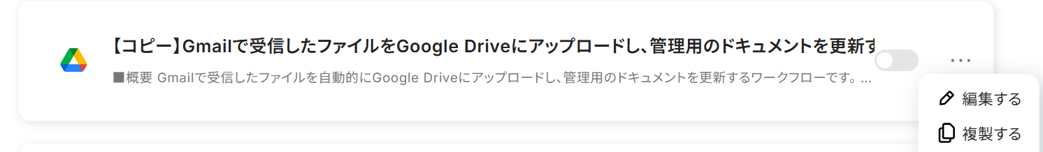 Gmailで受信したファイルを自動的にGoogle Driveにアップロードし、管理用のドキュメントを更新するワークフローです。