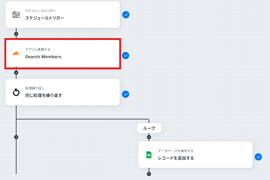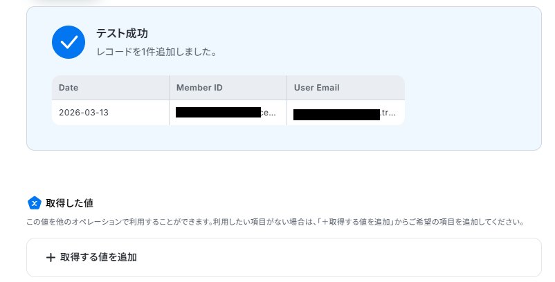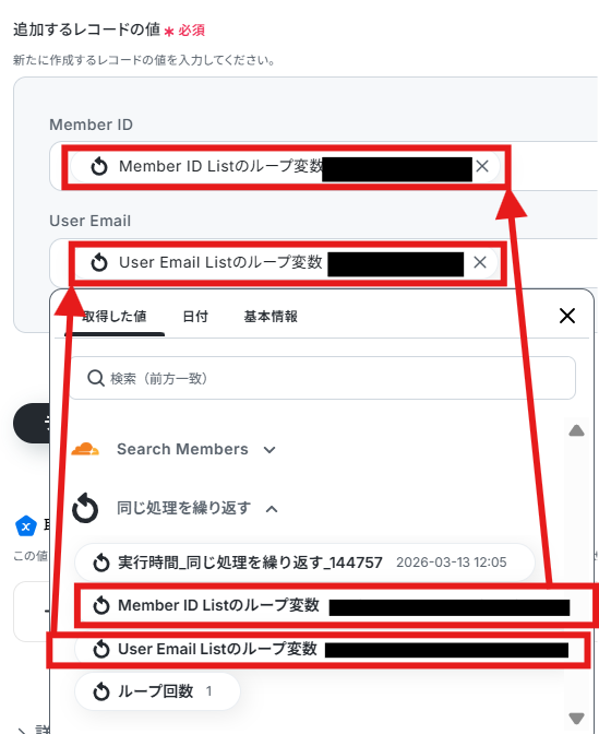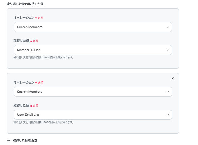 「Member ID」と「User Email」は前ステップの「同じ処理を繰り返す」の値から入力しましょう。