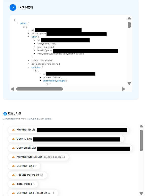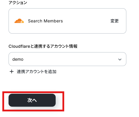 - Cloudflareの「Search Members」アクションでは、メンバー情報を検索・取得したいアカウントのIDを任意で設定してください。