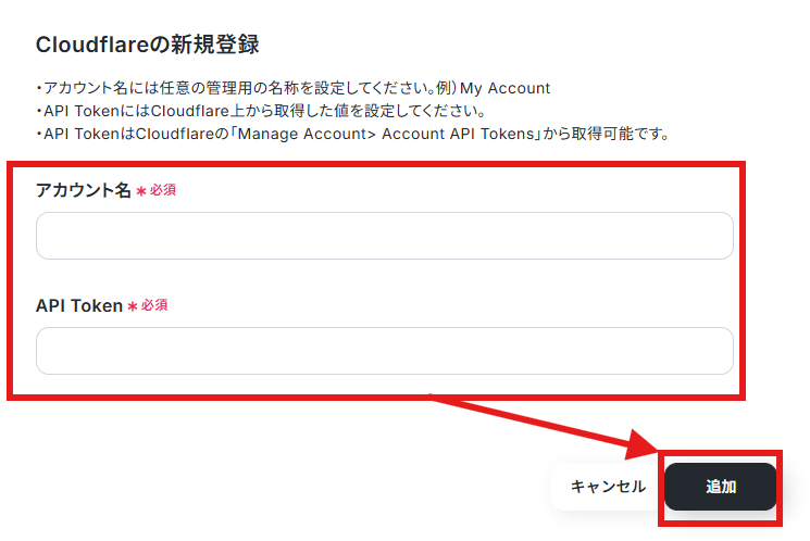 以下の画面が出てくるので、画面注釈に沿ってアカウント名とAPI Tokenを設定してください。