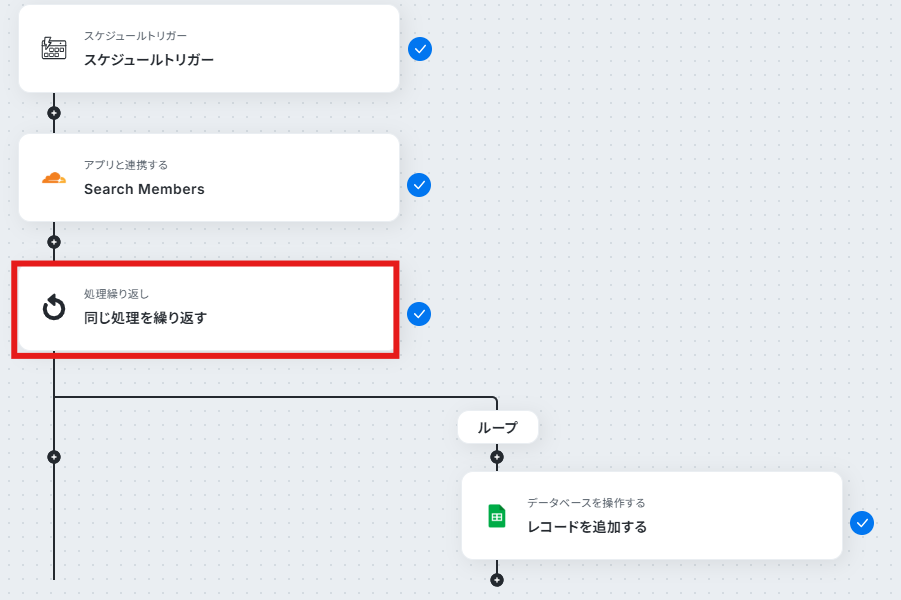 ※「同じ処理を繰り返す」オペレーションを使う場合は、チームプランまたはサクセスプランが必要です。フリープラン・ミニプランだと、設定してもエラーになってしまうのでご注意ください。