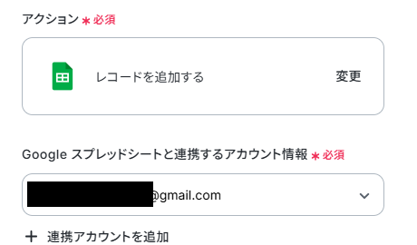 アクションはデフォルト設定のまま、アカウント情報は、連携したいアカウントが選択されているか確認してください。