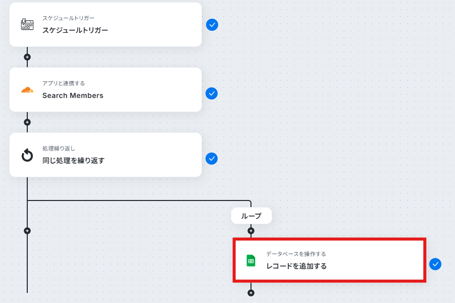 - 最後に、Google スプレッドシートの「レコードを追加する」アクションを設定し、Cloudflareから取得したアカウントのメンバー情報を指定したシートに追加します。