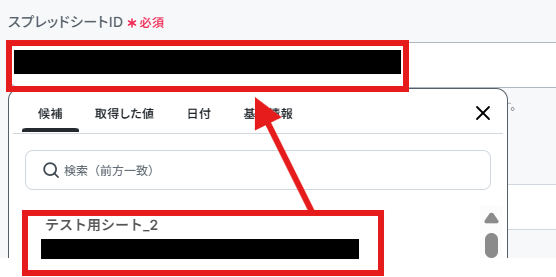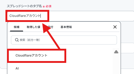 「スプレッドシートのタブ名」も同様に候補から入力します。