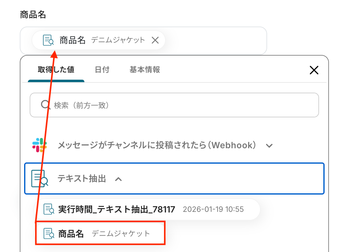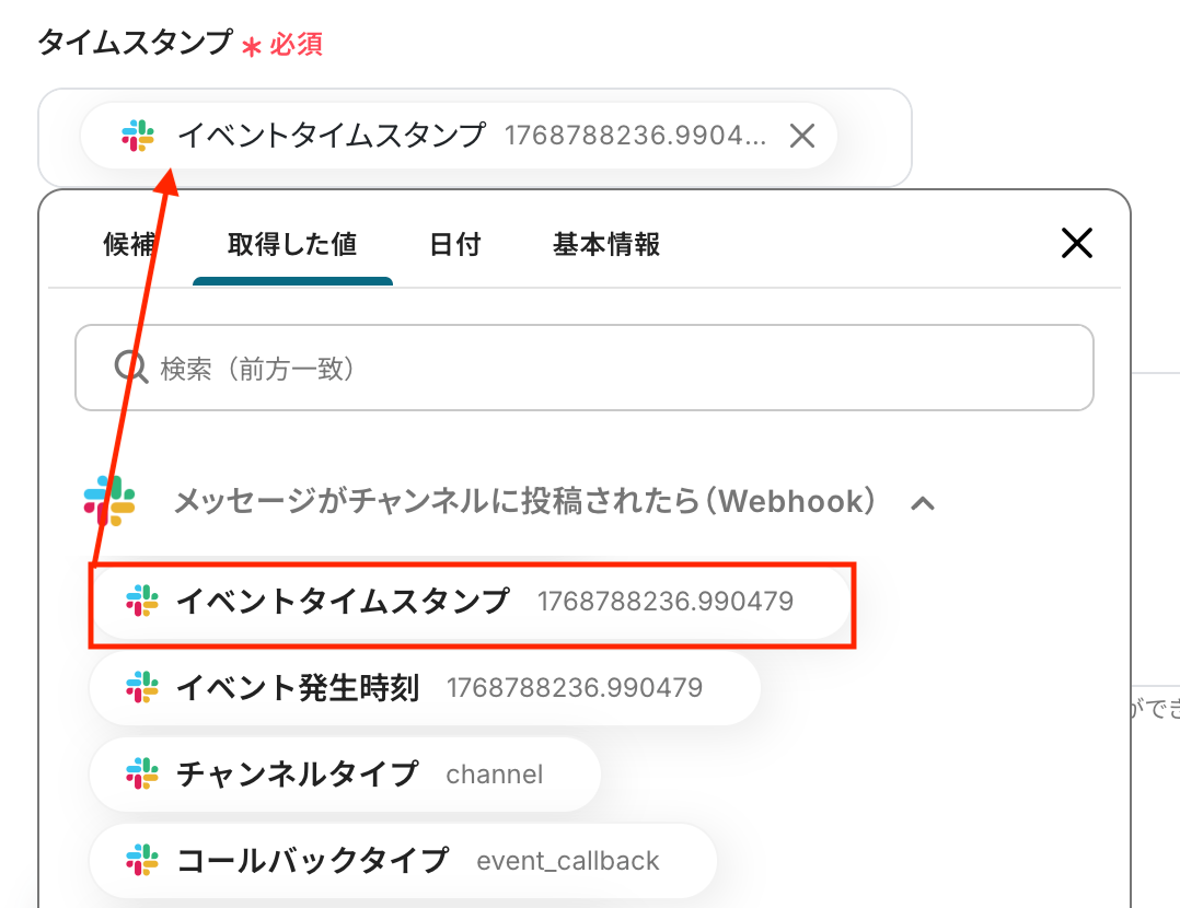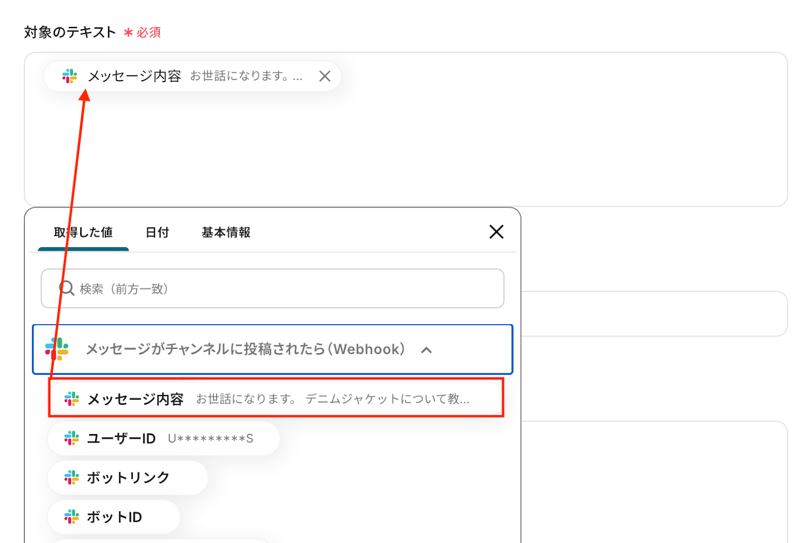 入力欄をクリックすると、前のステップでSlackから取得した値が表示されるので、選択しましょう。