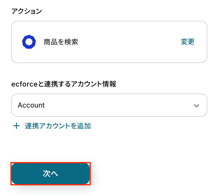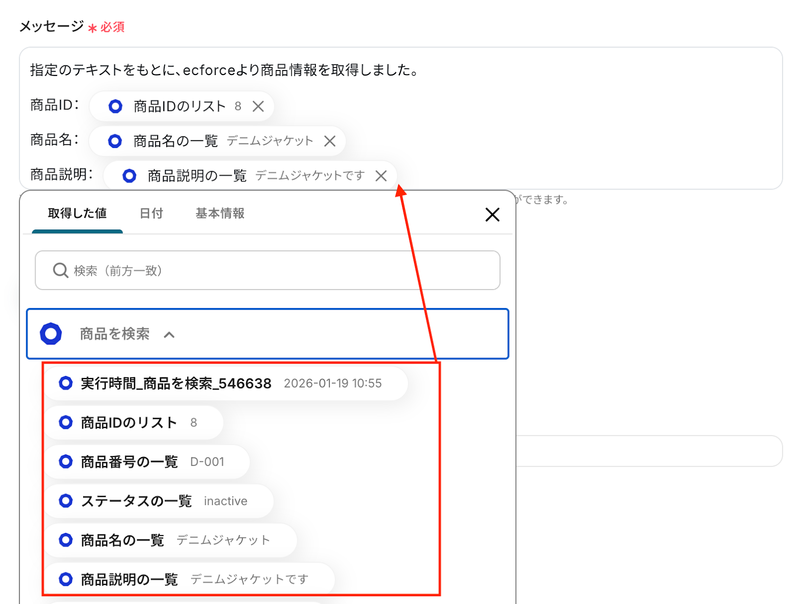 - 次に、オペレーションでecforceの「商品を検索」アクションを設定し、抽出したテキストをもとに商品を検索します