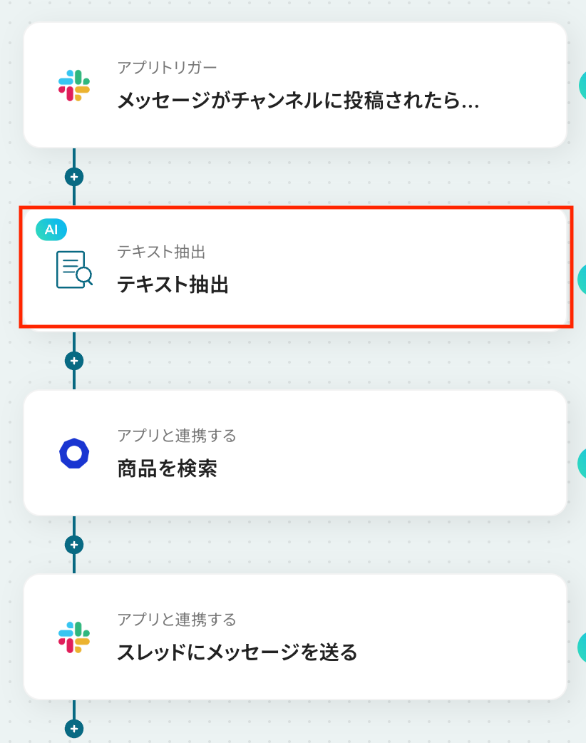 Slackのトリガーイベントで取得したメッセージ内容を対象に、AIで特定のテキストを抽出します。