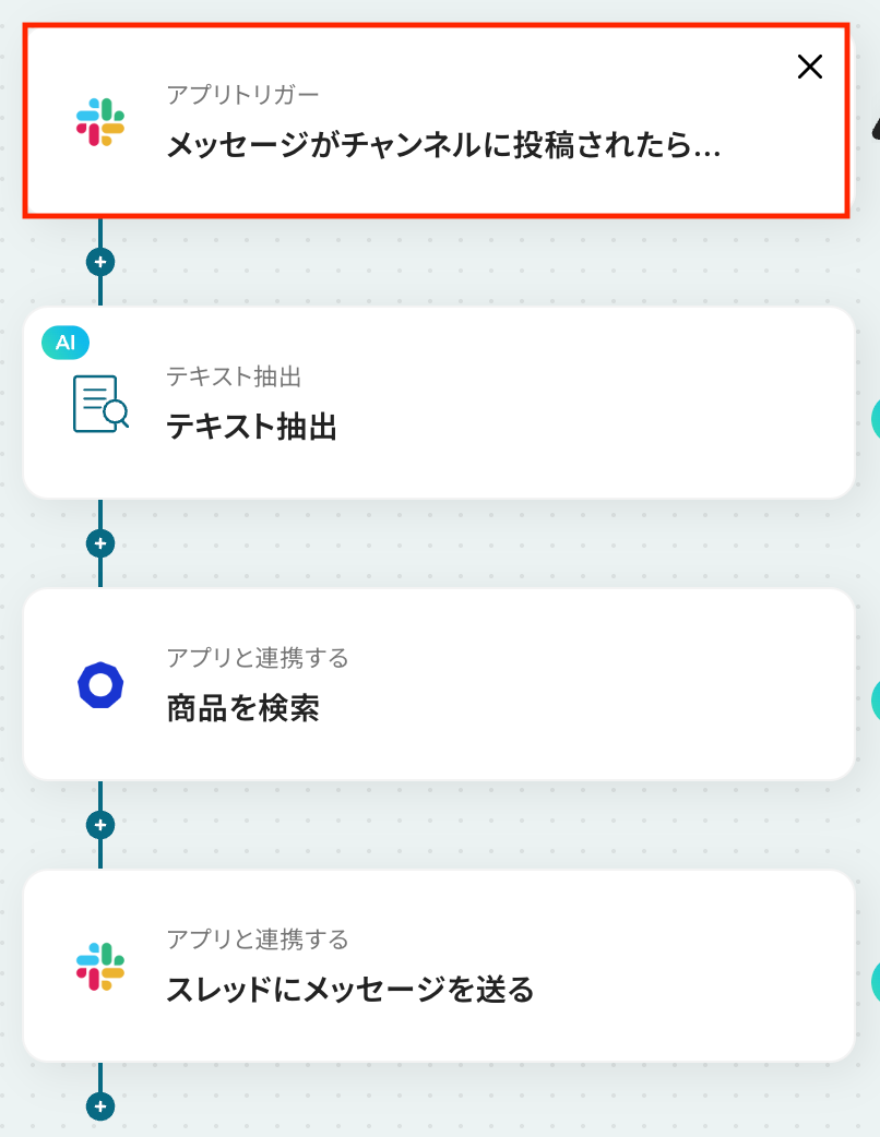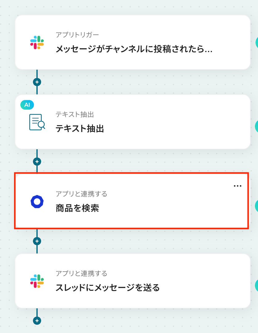 それではここから代表的な例として、Slackで特定のテキストを含むメッセージが投稿されたら、ecforceで商品を検索し、その結果をスレッドに自動で通知するフローを解説していきます!