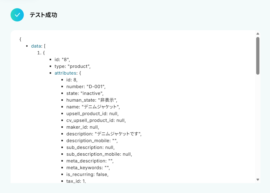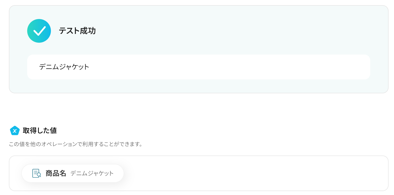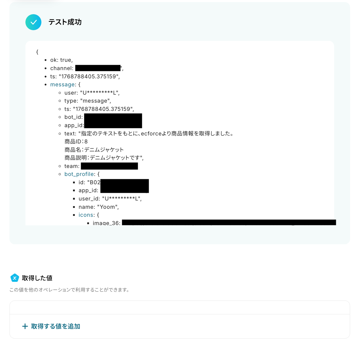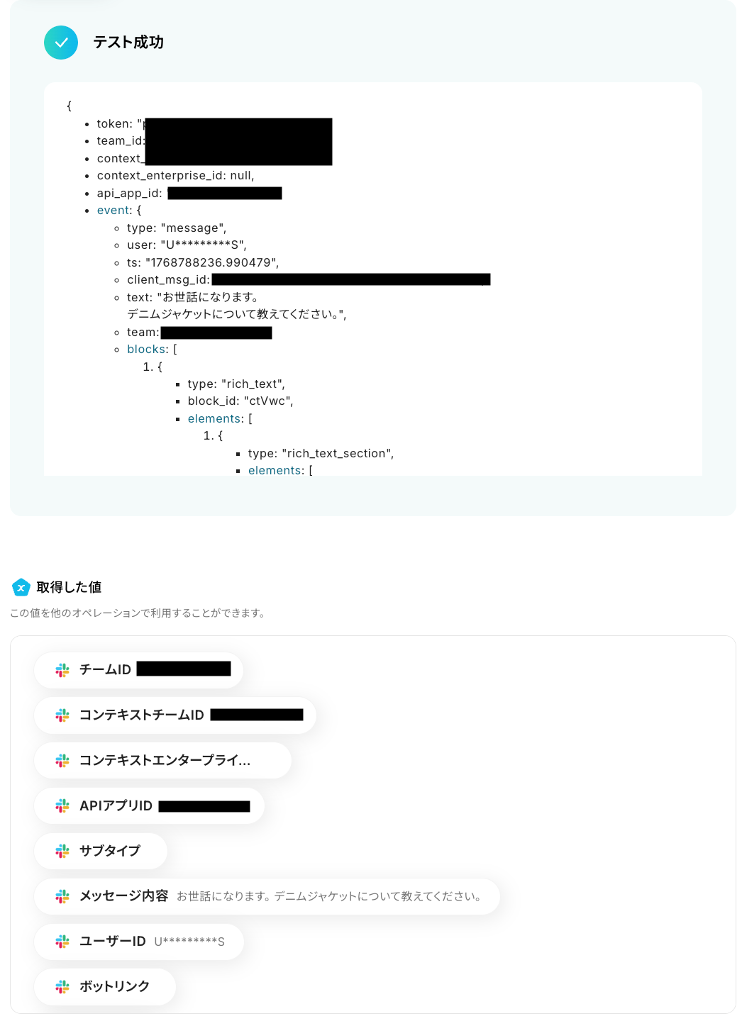 テストに成功すると、Slackに投稿されたメッセージに関する情報が一覧で表示されます。以下の画像の取得した値は、この後のステップで利用できます。