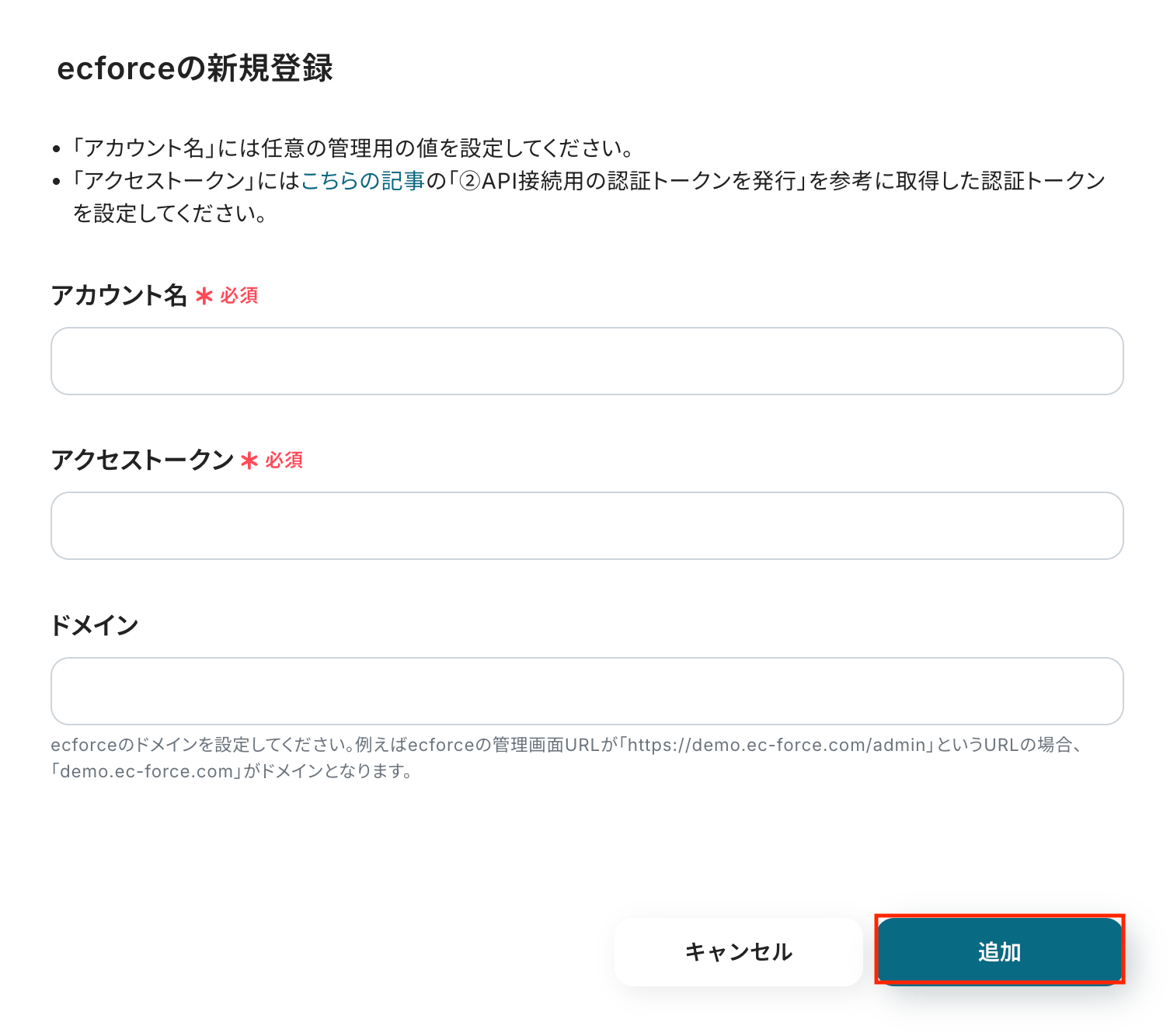 以下の画面が表示されるので、アカウント名、アクセストークン、ドメインを注釈に沿って入力し、「追加」をクリックしましょう。