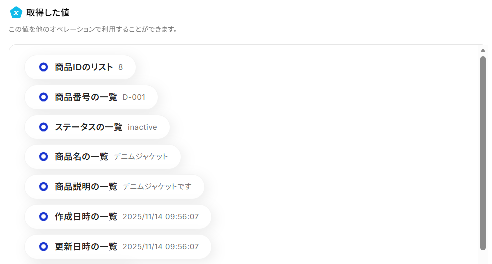 トリガーやオペレーション設定時に、「テスト」を実行して取得した値のことを指します。後続のオペレーション設定時の値として利用でき、フローボットを起動するたびに変動した値となります。