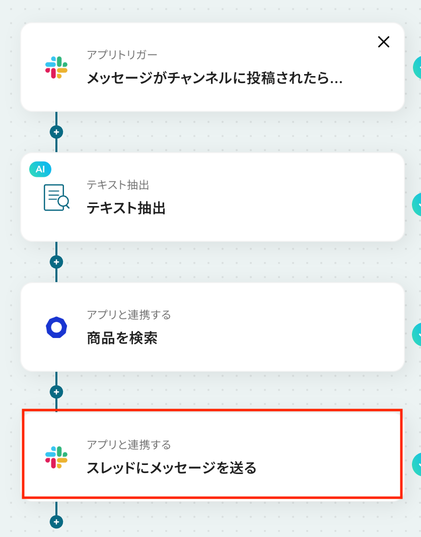 - 最後に、オペレーションでSlackの「スレッドにメッセージを送る」アクションを設定し、ecforceの検索結果を元の投稿のスレッドに通知します