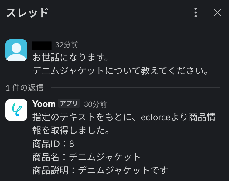Slackで指定のテキストを含むメッセージがチャンネルに投稿されたら、ecforceで商品を検索し結果をスレッドに通知する