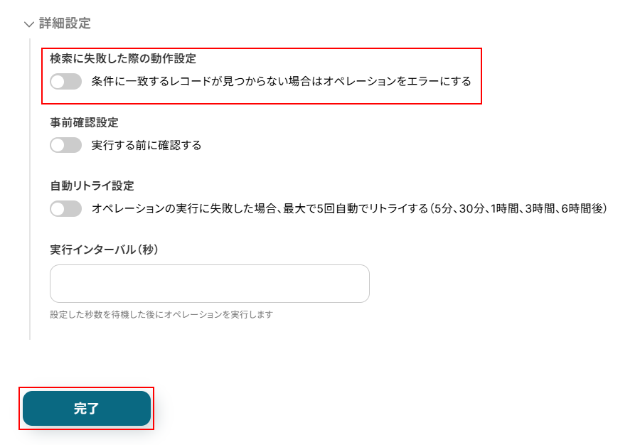以下の検索に失敗した際の動作設定の項目がOFF(グレーの状態)になっていることを確認しましょう。
