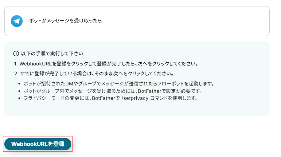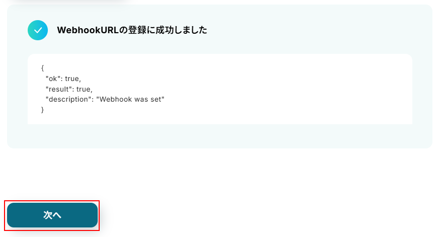 メッセージを送信出来たらYoomの画面に戻り、WebhookURLを登録をクリックします。