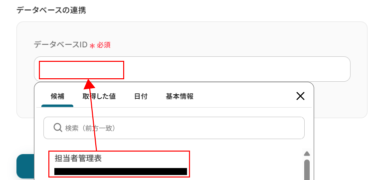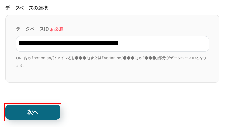 - Notionでレコードを検索するアクションでは、対象とするデータベースIDを任意で設定してください。商品マスタや社内FAQなど、用途に応じたデータベースを指定できます。