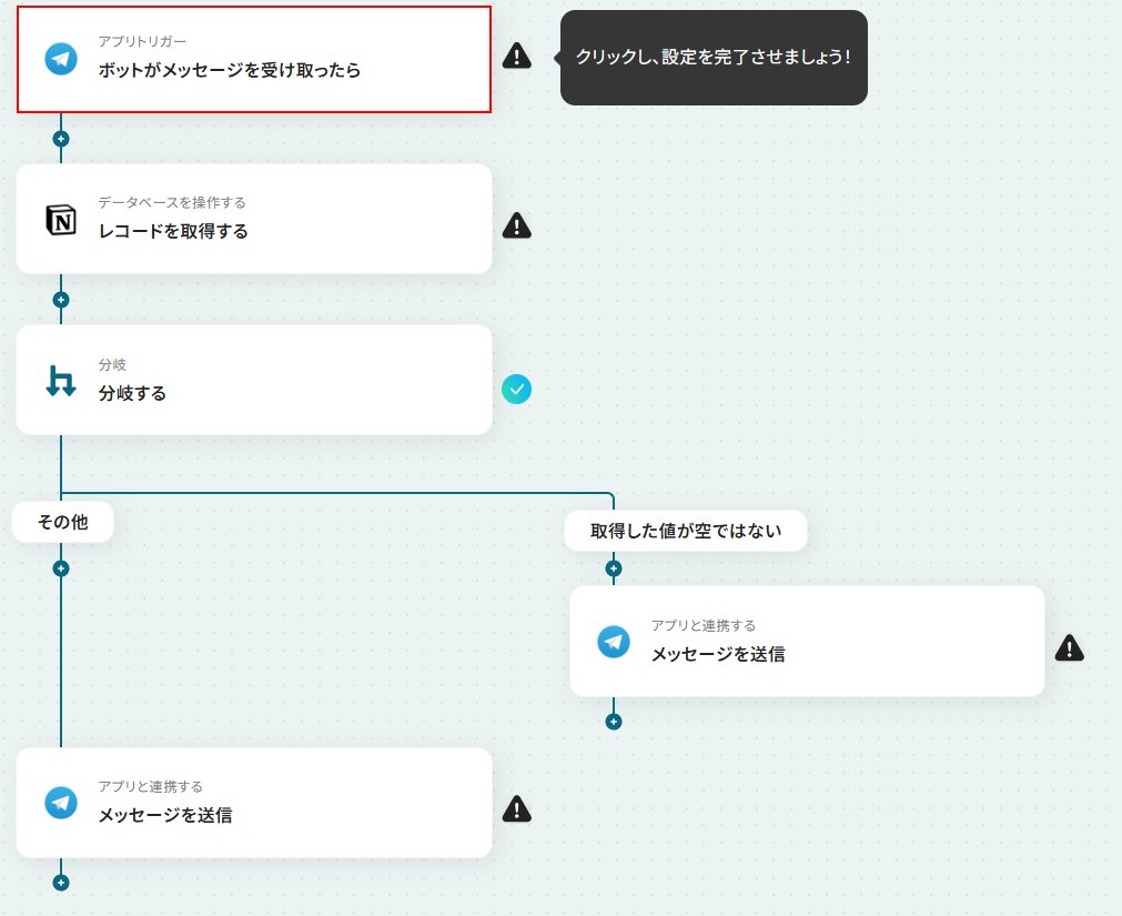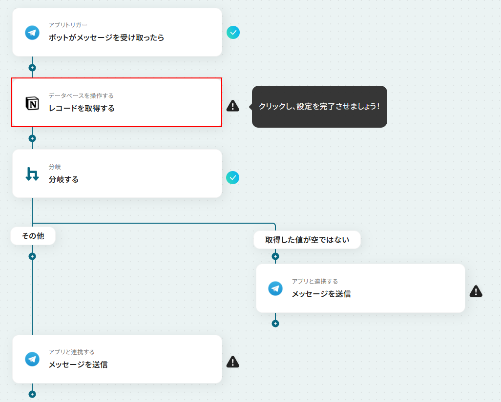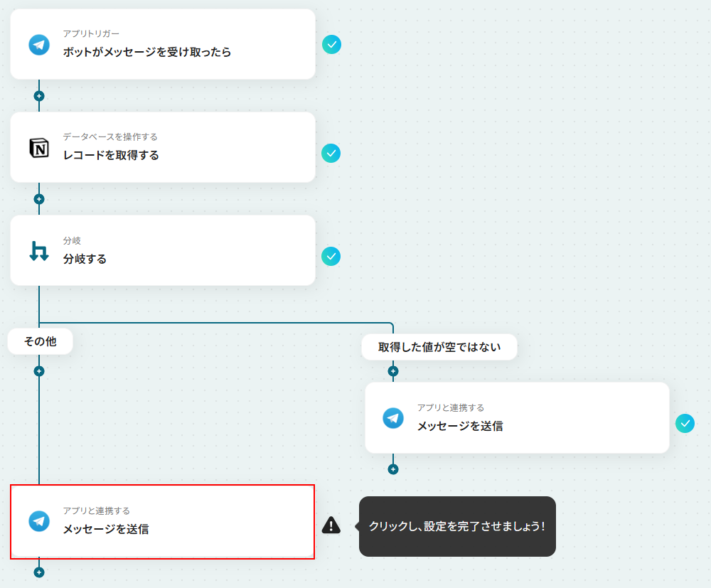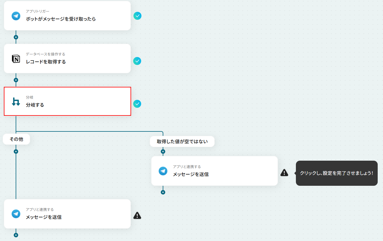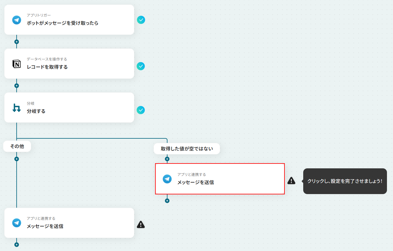 - 最後に、それぞれの分岐先にTelegramの「メッセージを送信」アクションを設定し、検索結果に応じた内容を返信するよう設定します。