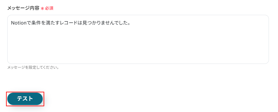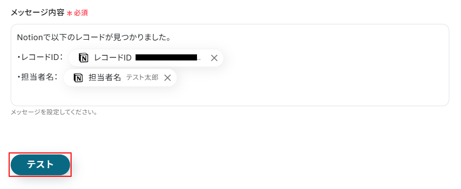 メッセージを送信出来たら、Yoomの画面に戻りテストをクリックしましょう。