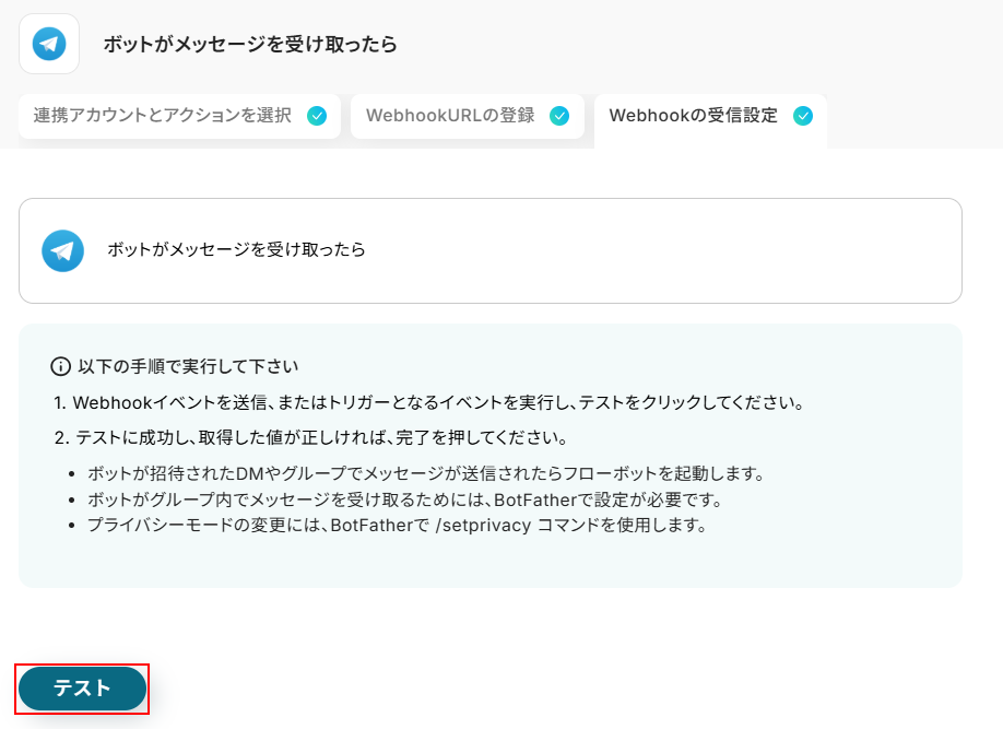 設定できたらテストをクリックしましょう。