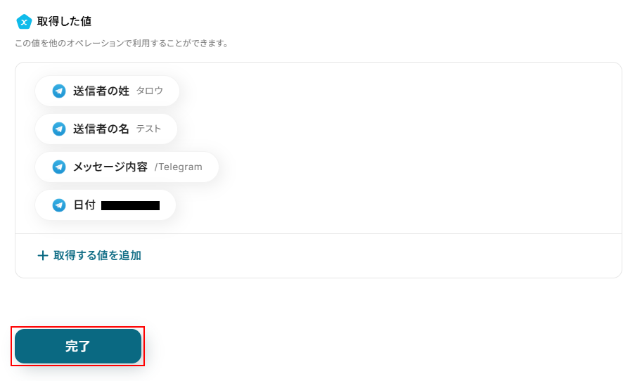 取得した値は実行した結果が設定される動的な値として利用できるため、このあとの設定でも使用します。