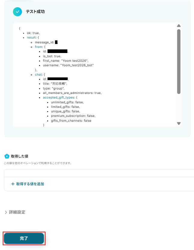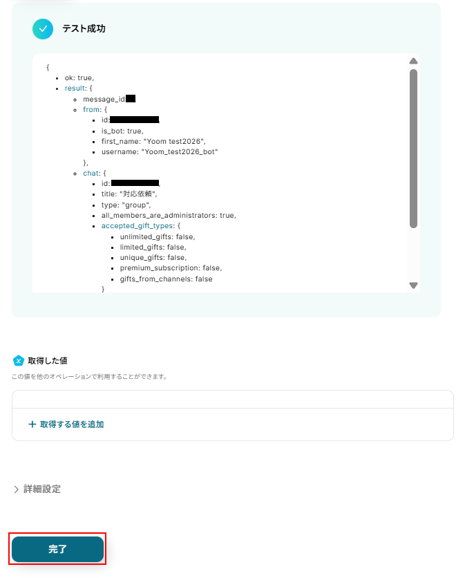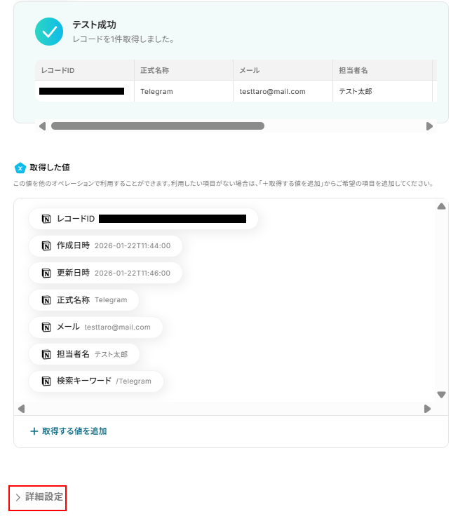 テストに成功するとテスト成功画面と取得した値が表示されますのでご確認ください。