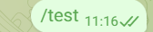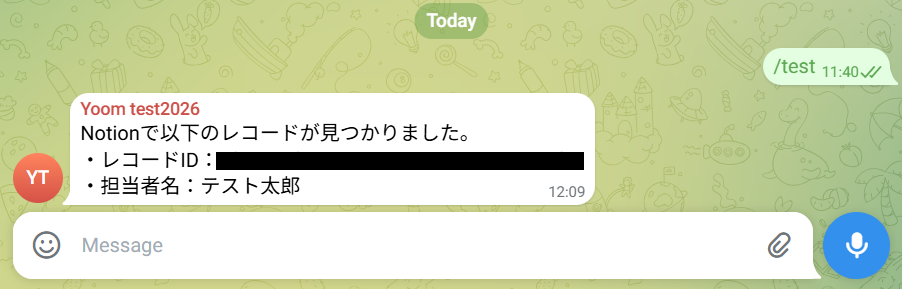 次に、Telegramの画面に移動し、トリガーとして利用したいチャットルーム(マイアプリ連携でボットを招待したもの)から、/testなどのメッセージを送信します。