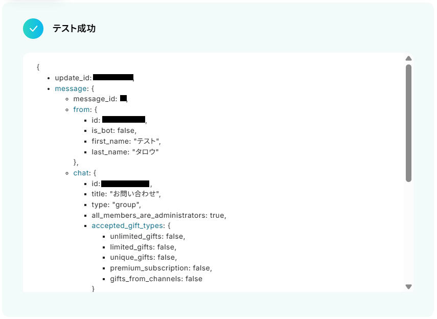 - Telegramの「メッセージを送信」アクションでは、通知メッセージのフォーマットや内容を自由にカスタマイズできるほか、通知を送信する先のチャットIDを、個人のチャットやグループチャットなど、運用に合わせて設定してください。