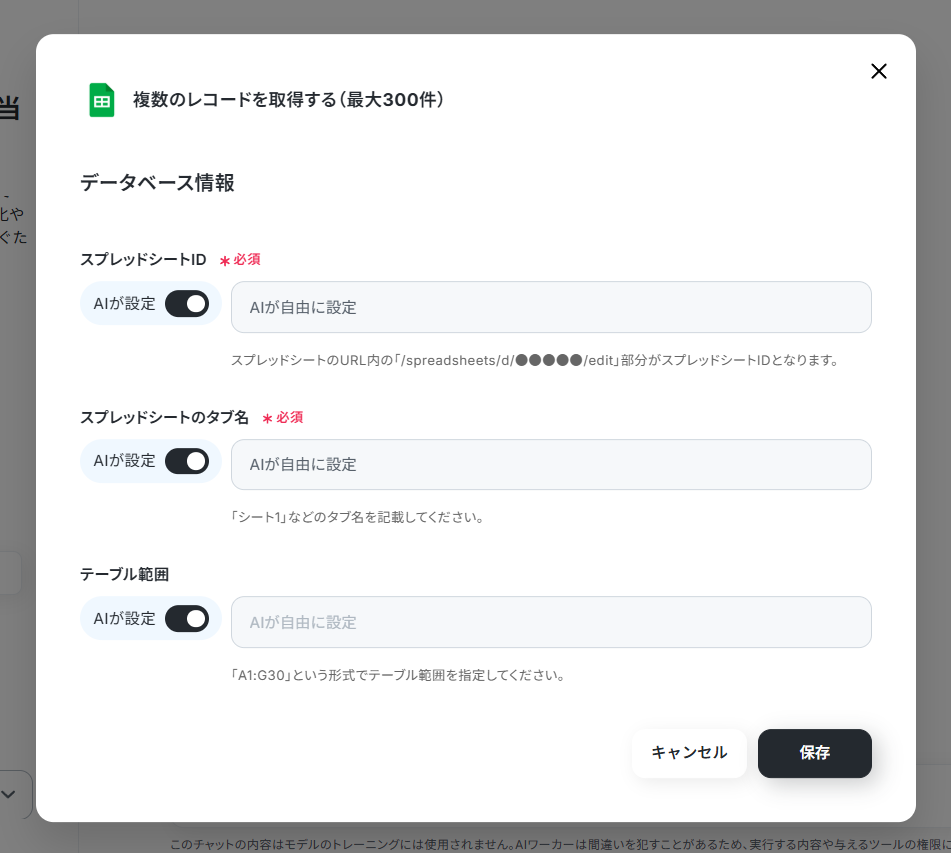 マニュアルにシートIDなどを記載している場合は指定しなくても動作しますが、設定しておくことでAIワーカーがその他のシートにアクセスができなくなります。