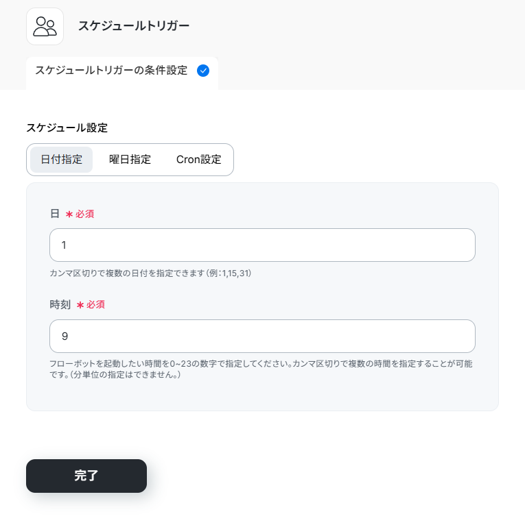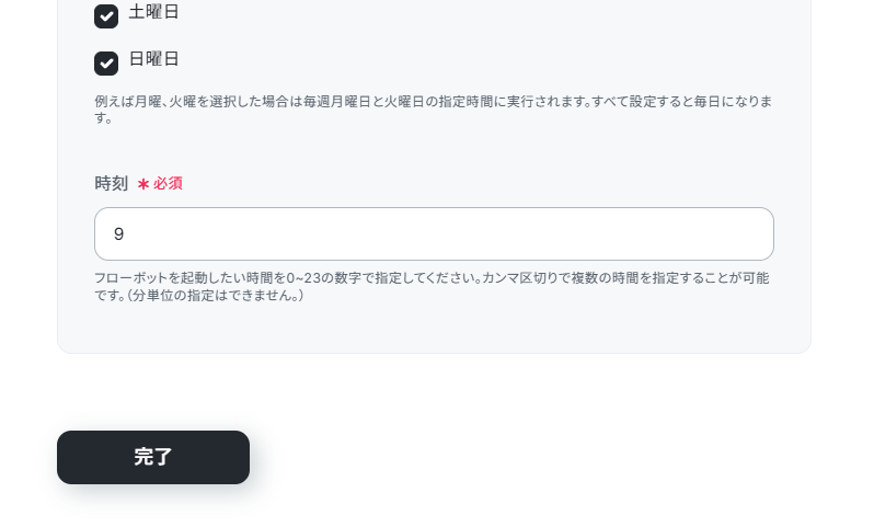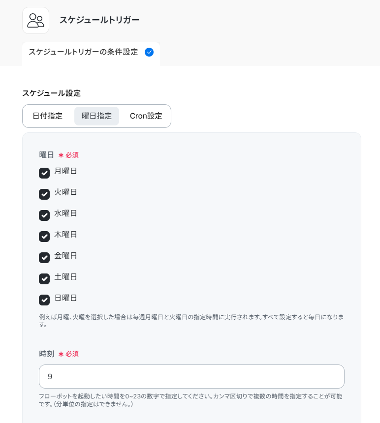 デフォルトでは「土日を含む毎朝9時」になっています。運用に合わせて、日付や時刻を変更してください。日付指定やCronによる設定も可能です。