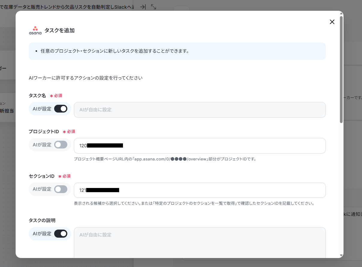 3. 「タスクを追加」アクションにチェックを入れて、プロジェクトIDやセクションIDを指定する。