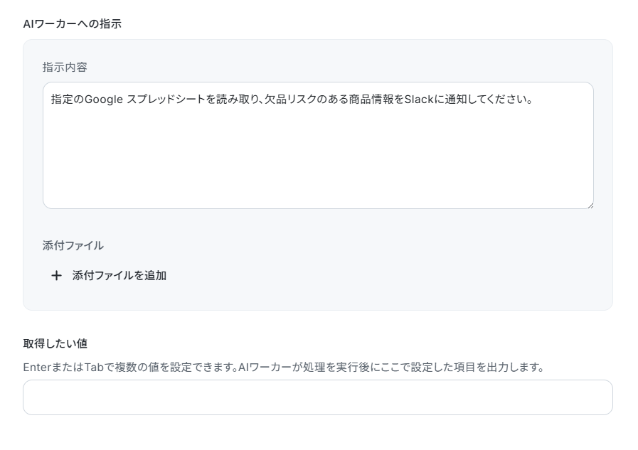役割やマニュアルはAIワーカー自体に設定されているため、ここではユーザーがAIワーカーを動かす際に出す命令を設定していきます。